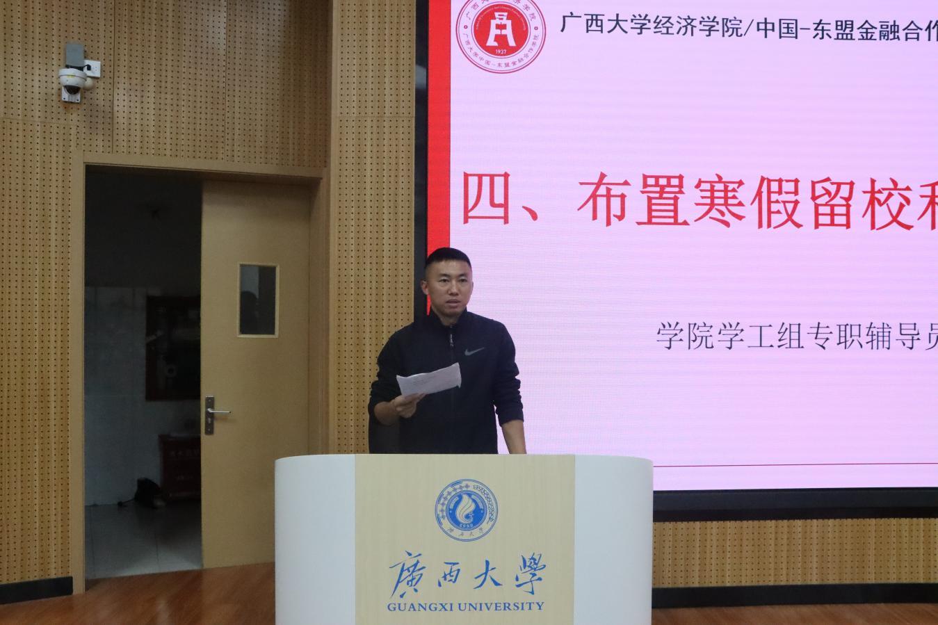 /中国-东盟金融合作学院学工组在第十教学楼10A-305教室组织召开2023-2024学年秋季学期期末全院主要学生干部大会。院党委副书记陈卉娟、团委书记王海希、辅导员覃晓阳、刘威,以及院级团学组织主要学生干部、各班班长和团支书参加本次会议。