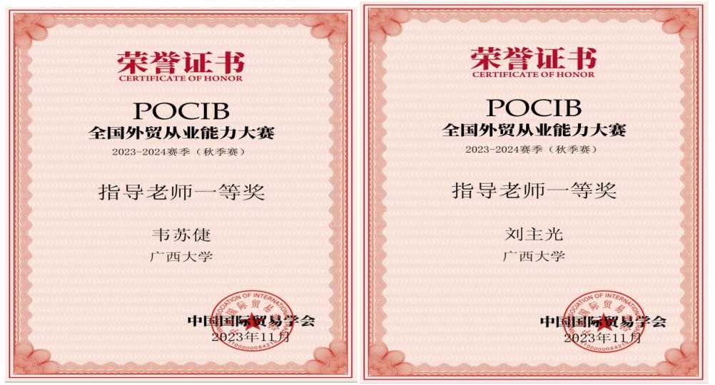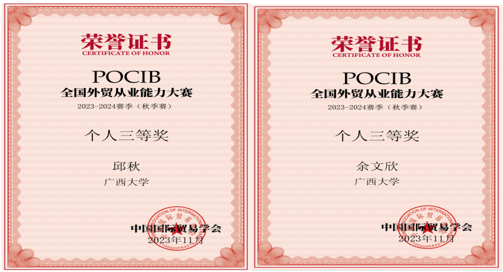 /中国-东盟金融合作学院10名国贸系学生组成的代表队参加了POCIB全国外贸从业能力大赛2023-2024赛季(秋季赛)。该项大赛赛前经过一个月的预选和准备阶段,正式比赛历时13天,共有373所院校、1056支队伍、共计10560名选手参加。在韦苏倢、刘主光两位老师的指导下,10名队员经过13天起早贪黑的业务操作,不懈努力,最终在1056支队伍中脱颖而出,以团体总分915.64的优异成绩,荣获POCIB全国外贸从业能力大赛2023-2024赛季(秋季赛)的团体一等奖。此外,团队还收获参赛选手个人二等奖3项,个人三等奖2项,指导教师一等奖2项。十位参赛选手在比赛中业务能力过硬,均获得中国国际贸易学会颁发的外贸从业资格证书。