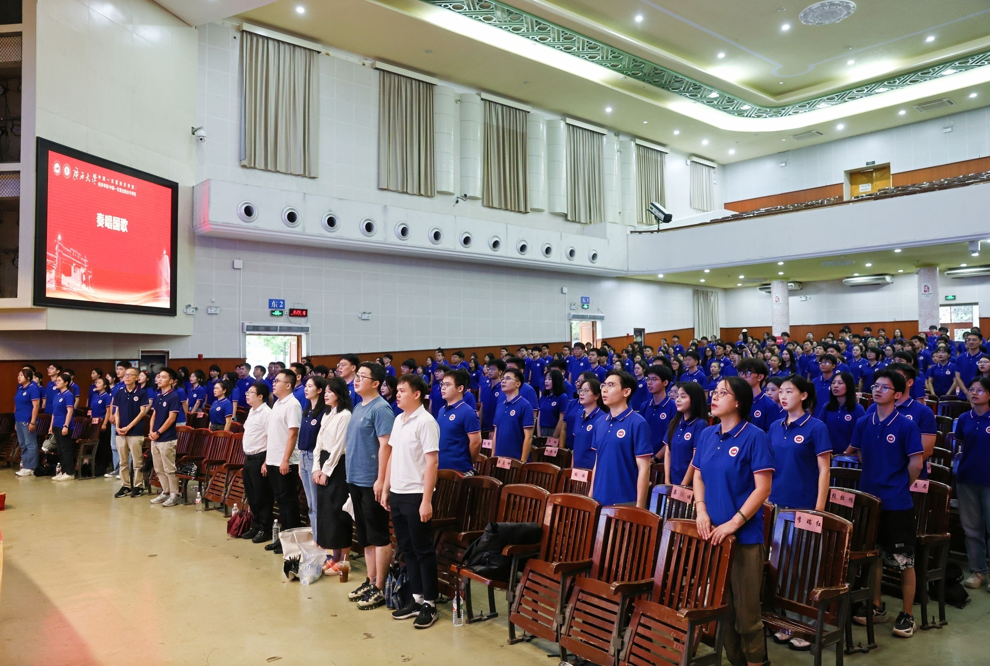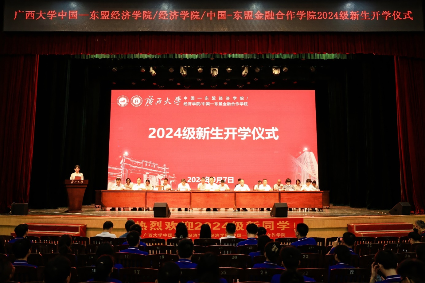 /中国—东盟金融合作学院在学校大礼堂为2024级533名新生举行开学仪式,校党委常委、副校长、院党委书记(兼)夏国恩,院党委常务副书记罗诚,院长李光辉,常务副院长梁运文,院党委副书记、纪委书记陈卉娟,副院长谭春枝,副院长梁权熙,副院长杨璞出席仪式,陈卉娟主持仪式。