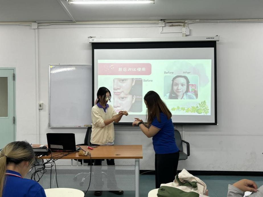 The highlight of the exchange was a showcase prepared by Chiang Mai University’s Chinese language students, who presented locally inspired products including herbal hand cream, Snake Brand body powder, peppermint nasal balm, handmade soaps, and a variety of regional snacks. These exhibits reflected the integration of Thai traditional craftsmanship and modern innovation, as well as the diversity of Thailand’s health, daily-use, and food industries. Students introduced the production processes, raw materials, and cultural context, sparking lively discussions with the Guangxi delegation on market positioning and potential cooperation.