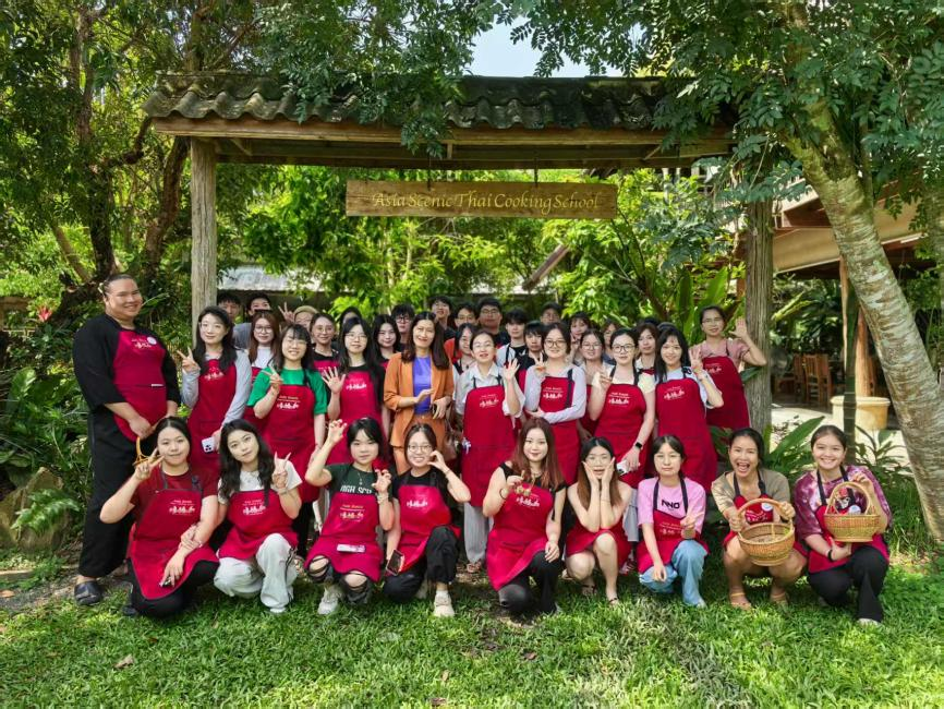 During the Thai cuisine cooking class, students from the visiting delegation gained hands-on experience in preparing classic Thai dishes, allowing them to appreciate the authentic flavors and deeply understand the essence of Thai culinary culture. The kitchen was filled with laughter and the aroma of ingredients as the students enthusiastically exchanged ideas and collaborated in a lively atmosphere. This immersive experience enabled them to truly “engage with the culture and embrace its values,” laying a solid foundation for the school’s comprehensive efforts to cultivate cross-cultural talent with a global perspective in the ASEAN region.