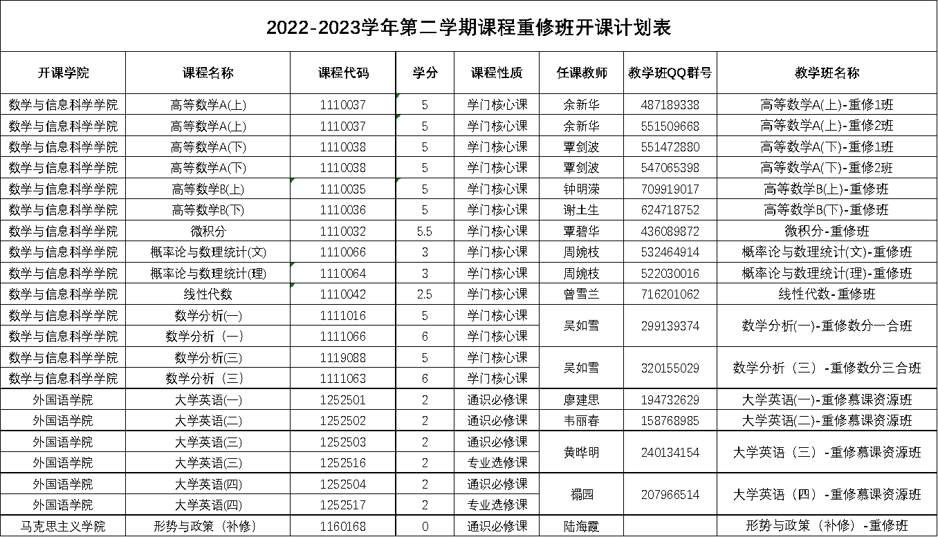 2022-2023学年第二学期课程重修班开课计划表