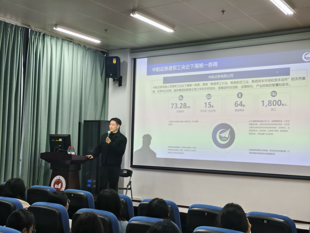 辅导员于娜老师代表学院对中航证券一行表示欢迎。中航证券财务管理部王彦利首先介绍企业概况,阐明公司作为我国军工央企旗下唯一证券公司,隶属于中国航空工业集团,是中航工业产融控股股份有限公司的重要成员。