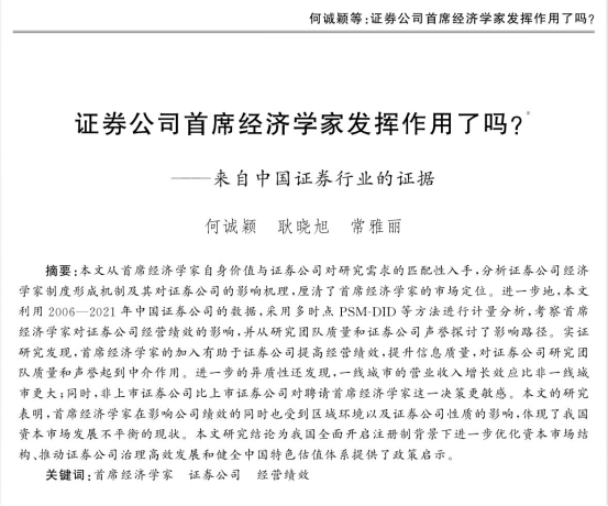 /中国-东盟金融合作学院何诚颖教授、常雅丽老师及其合作者广西民族大学讲师耿晓旭博士的论文《证券公司首席经济学家发挥作用了吗》正式发表于经济学动态(2023年第8期)。研究分析了证券公司经济学家制度形成机制及其对证券公司的影响机理,厘清了首席经济学家的市场定位。