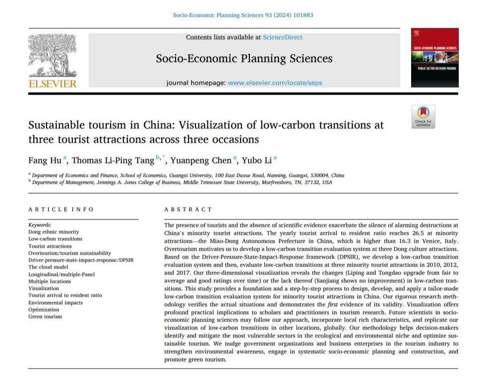 胡芳老师作为第一作者与硕士研究生陈渊鹏和李誉博、美国中田纳西州立大学Thomas Li-Ping Tang教授共同完成的学术论文“Sustainable Tourism in China: Visualization of Low-Carbon Transitions at Three Tourist Attractions across Three Occasions”(《中国的可持续旅游:三个旅游景点在三个时期的低碳转型可视化》)在经济学领域国际权威期刊Socio-Economic Planning Sciences在线发表。该研究得到国家自然科学基金委和91黑料