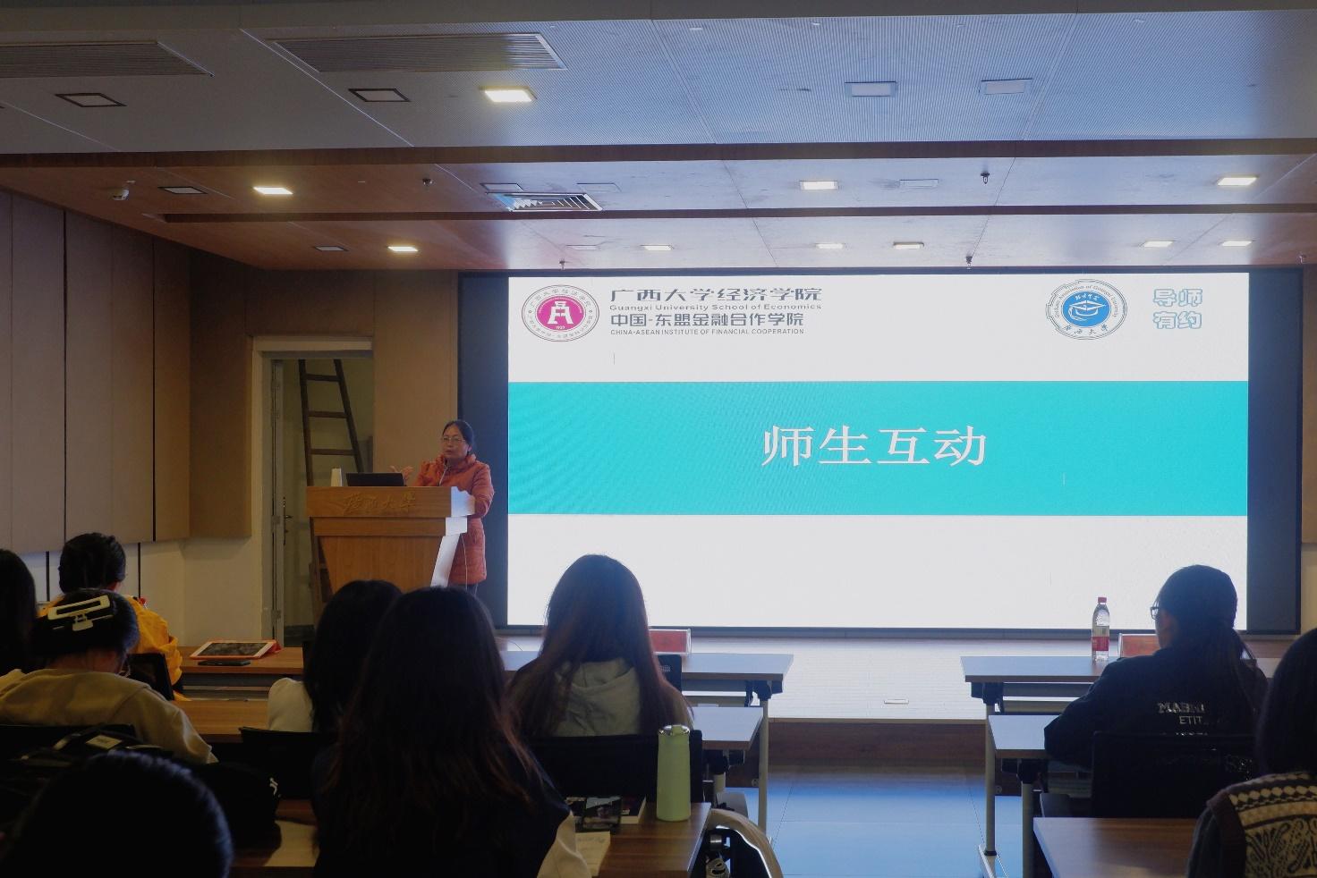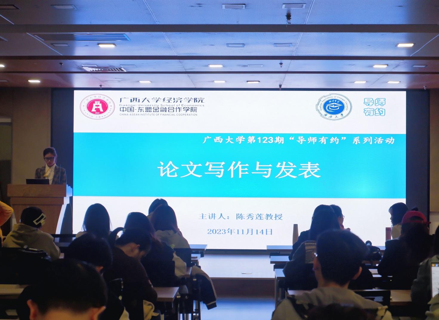第2期“导师有约”活动。本次学术讲座以“论文写作与发表”为主题,由国贸系陈秀莲教授主讲。学院团委书记王海希、学工组辅导员覃晓阳出席本次活动。