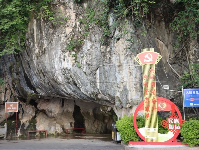 结束了烈士陵园参观之后,我们还在带队老师的建议下前往了坐落于那坡县北部的感驮岩。感驮岩一带的地势平坦开阔,岩体雄奇峻峭,堪称是大自然的鬼斧神工之作。除了神奇的自然景观,我们还见到了丘柳松烈士墓和毛主席同志的摩崖石刻。