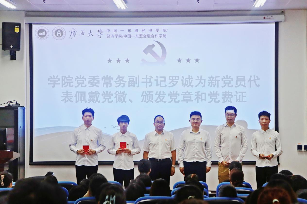 宣誓仪式在雄壮的国歌中拉开帷幕。陈卉娟宣读学院党委2023-2024学年新发展党员名单。罗诚为新党员代表佩戴党员徽章,并颁发《中国共产党章程》和《党费证》。
