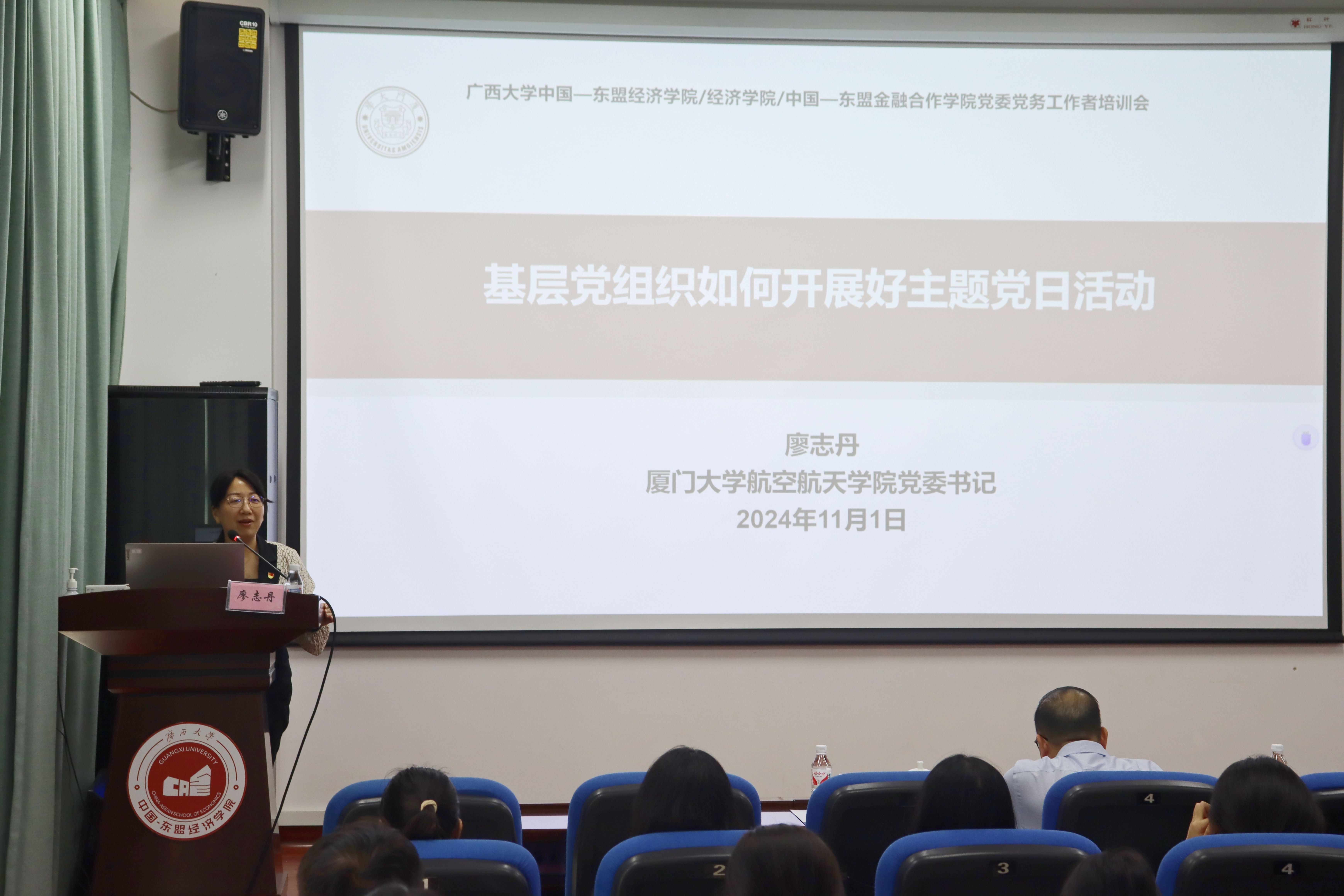培训会上,廖志丹以《基层党组织如何开展好主题党日活动》为题,从立足“高”字强站位、立足“实”字夯基础、立足“变”字求创新、立足“效”字显成果等四个方面为大家作了一场透彻深入、鲜活生动的党务工作经验分享报告。她指出,基层党建重在活动、重在制度、重在人心。基层党务工作要严格按照党中央要求,将“三会一课”、主题党日活动、谈心谈话等制度不折不扣落实,在执行过程中,既要做到严肃党内生活,又要做到工作有温度、服务暖人心。她结合自身多年来的党建工作实践和心得体会进一步讲述了开展主题党日活动的思路设计、方式创新、活动载体、品牌打造等,图文并茂、绘声绘色的讲述引发在场师生的共鸣和思考。大家纷纷表示,廖志丹书记的精彩分享对做好基层党建工作具有很强的针对性和指导性,将积极借鉴和学习优秀基层党组织的先进经验和做法,创新工作思路和方法,推动91黑料