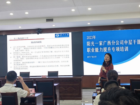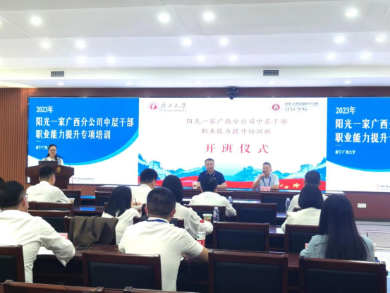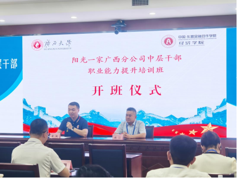 承接的阳光一家广西分公司中层职业能力提升专题培训班正式开班。学院院长助理覃诚博士、阳光一家家庭综合保险销售服务有限公司广西分公司总经理张喆,出席开班仪式并分别致辞。共30名学员参加本次培训。