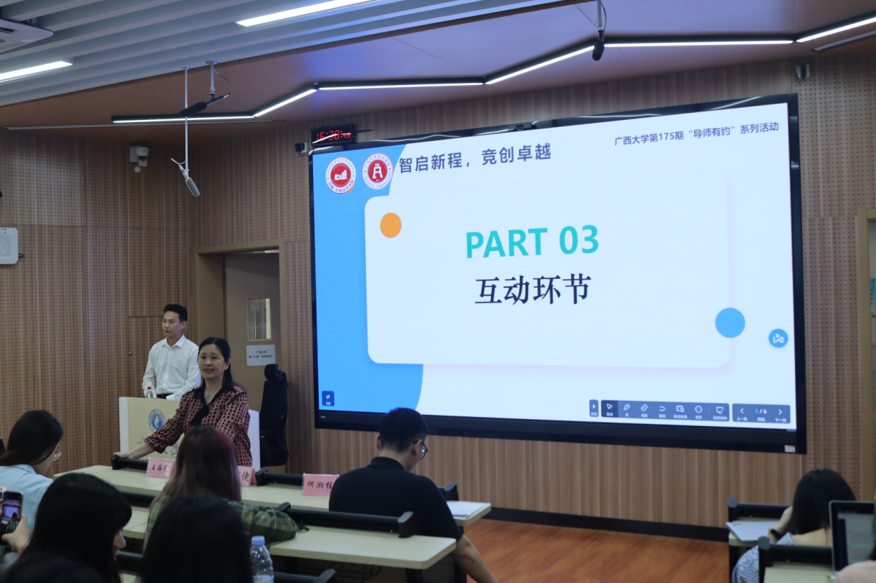 在师生互动环节中,同学们围绕“如何平衡课程与竞赛”、“如何从本专业出发构思项目”和“如何紧贴实际实现理论落地”等问题积极提问。韦老师一一进行解答。师生交流过程中,现场氛围热烈,大家纷纷表示受益良多。