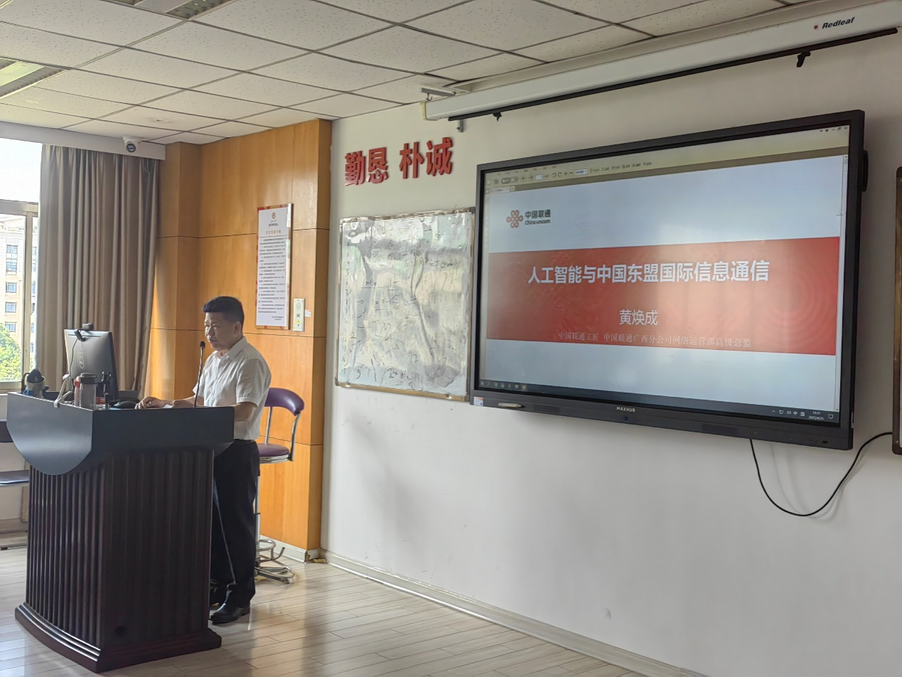 国际经济与贸易系在《电子商务理论与实践》课程中创新开展校企联合教学实践,邀请中国联通广西分公司网络运营部高级总监黄焕成走进本科课堂,以“行业专家+场景教学”模式,为学生带来《人工智能与中国东盟国际信息通信》专题授课。