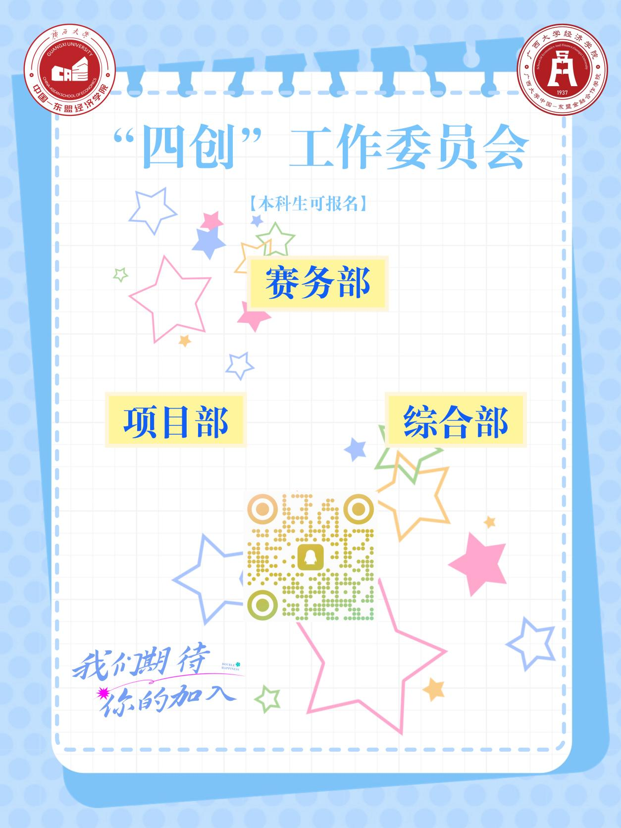 “四创”基地组成的重要机构之一。“四创”为引导本院学生深入金融经贸领域交流实践,鼓励并服务学生参与A+类及多项经管类学科竞赛,进一步落实“以赛促学、以赛促教、以赛促研、以赛促创”的先进教育理念,为成就更多专业性、创新性、前沿性的金融经贸人才时刻准备着。“四创”工作委员会下设三个职能部门:赛务部、项目部、综合部。