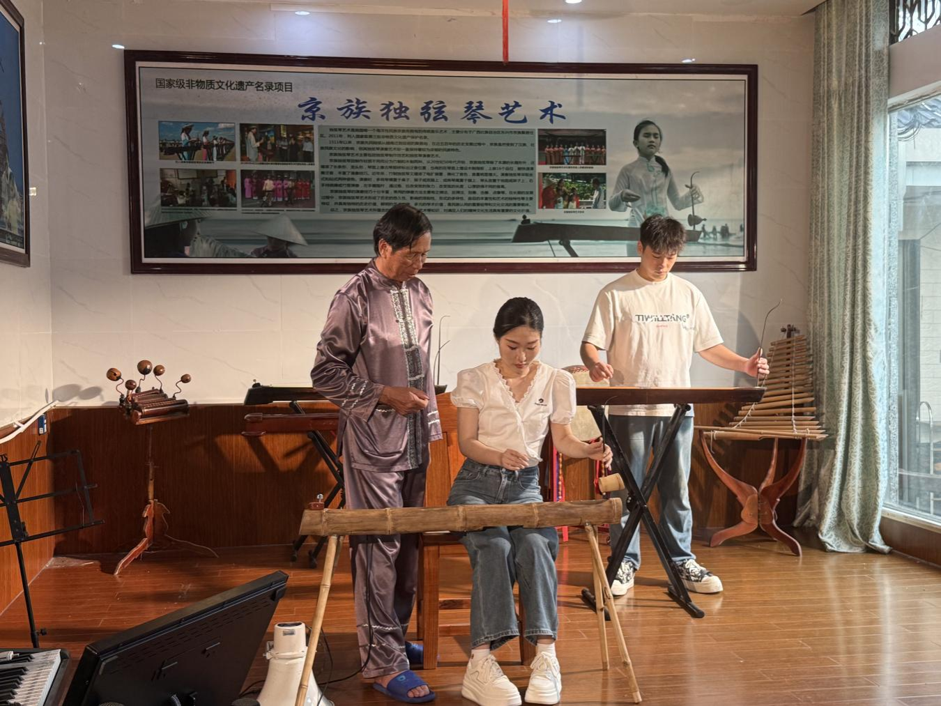 在独弦琴艺术国家级传承人苏春发老师的悉心指导下,师生们不仅学会了基本的独弦琴弹奏技巧,更深刻理解了京族人民“靠海吃海、以歌代言”的文化传统。这种沉浸式、体验式的思政实践,让抽象的文化自信变得可触可感,让宏大的家国情怀落到了具体的人文关怀中。