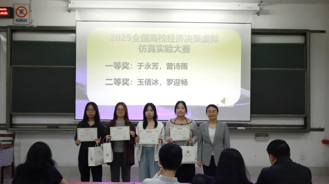 随后,举行表彰和颁奖仪式。学院对在“经济新星” 大赛、2025iCAN大赛“精创杯”数字经济决策创新挑战赛,以及2025全国高校经济决策虚拟仿真实验大赛中表现突出的同学进行了表彰,并颁发荣誉证书,以此充分肯定他们在学术创新与实践探索过程的努力与优异成果。其中,“经济新星”大赛为本专业举办的赛事,旨在提高同学们关注现实经济发展能力,增强实践和研究水平,分为课程案例、调查报告和学术论文三个赛道,至今已举办了第三届。
