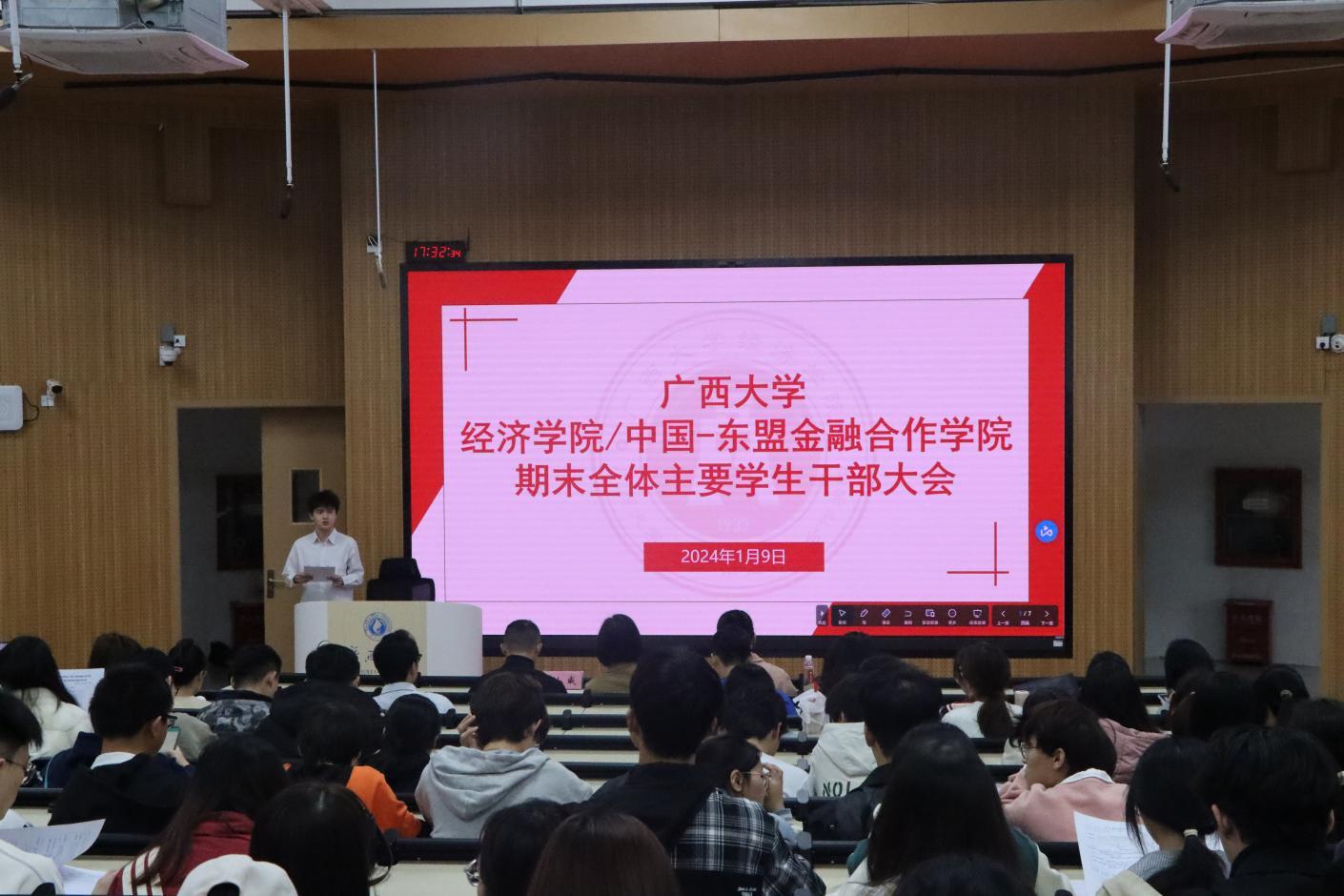 /中国-东盟金融合作学院学工组在第十教学楼10A-305教室组织召开2023-2024学年秋季学期期末全院主要学生干部大会。院党委副书记陈卉娟、团委书记王海希、辅导员覃晓阳、刘威,以及院级团学组织主要学生干部、各班班长和团支书参加本次会议。