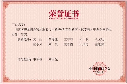 /中国-东盟金融合作学院10名国贸系学生组成的代表队参加了POCIB全国外贸从业能力大赛2023-2024赛季(秋季赛)。该项大赛赛前经过一个月的预选和准备阶段,正式比赛历时13天,共有373所院校、1056支队伍、共计10560名选手参加。在韦苏倢、刘主光两位老师的指导下,10名队员经过13天起早贪黑的业务操作,不懈努力,最终在1056支队伍中脱颖而出,以团体总分915.64的优异成绩,荣获POCIB全国外贸从业能力大赛2023-2024赛季(秋季赛)的团体一等奖。此外,团队还收获参赛选手个人二等奖3项,个人三等奖2项,指导教师一等奖2项。十位参赛选手在比赛中业务能力过硬,均获得中国国际贸易学会颁发的外贸从业资格证书。