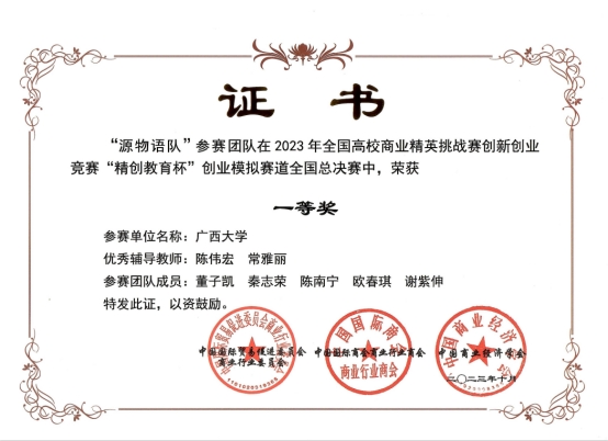 图1:创业模拟赛道“源物语队”获全国一等奖