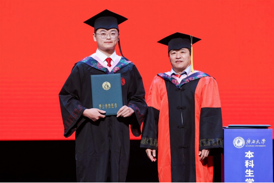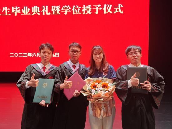 学位评定分委员会主席李光辉院长为2023届毕业生逐一拨穗、授予学位,学院学位评定分委员会各位委员在主席台上肃立见礼、与毕业生一一握手。