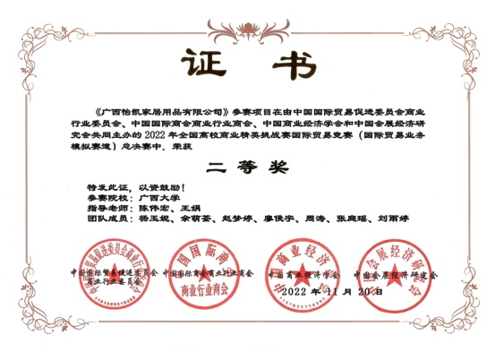 图2:“广西怡凯家居用品有限公司”全国总决赛获奖证书