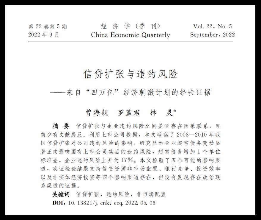 曾海舰、罗蓝君、林灵的论文“信贷扩张与违约风险——来自‘四万亿’经济刺激计划的经验证据”发表在2022年9月的《经济学(季刊)》第22卷第5期。该论文利用上市公司数据,考察了2008—2010年我国信贷扩张对公司违约风险的影响。研究显示企业超常债务变动显著正向影响国有上市公司其后的违约风险,超常债务增加1个单位标准差,企业违约风险上升约17%。本文检验了五个可能的影响渠道,实证检验结果支持信贷资源非市场配置、银行竞争、投资效率以及非实体经济投资等四个影响渠道存在,但没有发现存在政治联系渠道的证据。