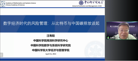 汪寿阳教授报告的主题为《数字经济时代的风险管理:从比特币与中国碳排放谈起》,从比特币的挖矿行为对中国碳排放造成的影响的角度出发,详细介绍了比特币的挖矿行为带来的风险,指出比特币的挖矿行为造成了电量的极大消耗等问题,并提出了相应的应对措施。