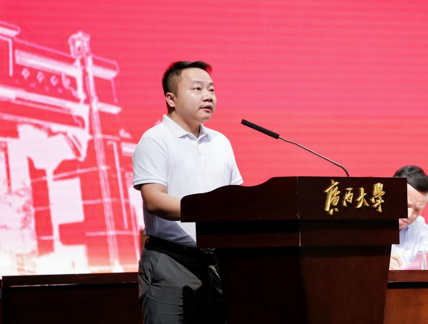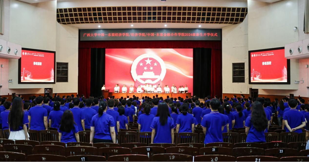 /中国—东盟金融合作学院在学校大礼堂为2024级533名新生举行开学仪式,校党委常委、副校长、院党委书记(兼)夏国恩,院党委常务副书记罗诚,院长李光辉,常务副院长梁运文,院党委副书记、纪委书记陈卉娟,副院长谭春枝,副院长梁权熙,副院长杨璞出席仪式,陈卉娟主持仪式。