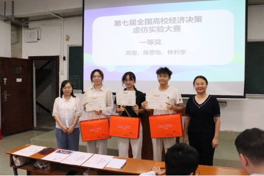 随后,举行了颁奖仪式。在学院的大力支持下,今年经济学专业举办了第二届“经济新星”大赛,并组织同学参加了全国高校经济决策虚拟仿真实验大赛、2024iCAN大赛“精创杯”数字经济决策创新挑战赛。随着同学们创新创业意识的提高,各项竞赛的参赛人数再创新高,作品质量不断提高,比赛成绩显著提升。参会老师为获奖的同学进行了颁奖。