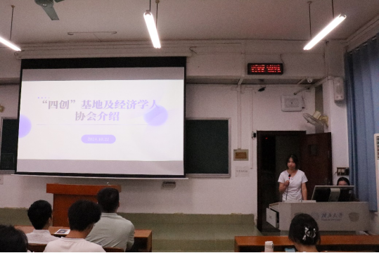 为使同学们对学科竞赛有更加清晰的认知,同时也激发同学们参加学科竞赛的热情,会上还安排了“四创”基地和经济学人协会介绍环节。廖春秀同学从学院“四创”基地和三大协会的组织架构、主要组织赛事等方面介绍了“四创”基地以及经济学人协会的基本情况,并欢迎大家加入经济学人协会。
