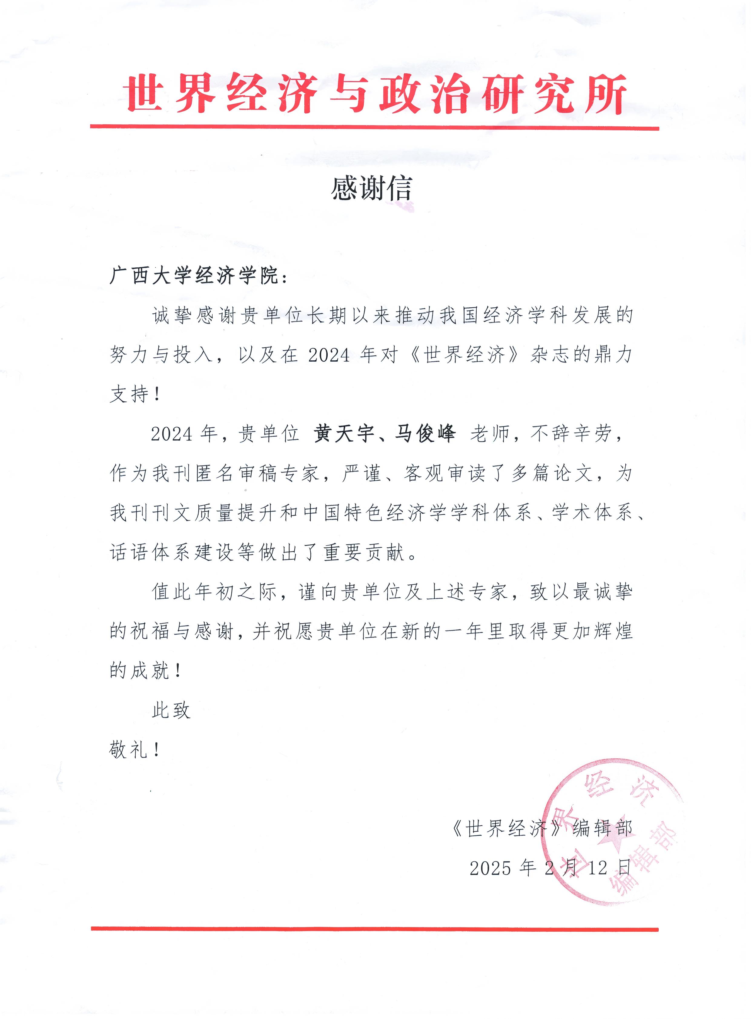 近日,世界经济与政治研究所《世界经济》编辑部向91黑料 发来感谢信,感谢91黑料 在2024年对《世界经济》杂志的鼎力支持,对91黑料 教师黄天宇、马俊峰担任该刊匿名审稿专家期间的卓越贡献表示感谢。作为审稿人,他们以严谨的学术态度、深厚的专业素养和客观公正的评审标准,审读了多篇学术论文,为杂志的刊文质量提升做出了重要贡献,为中国特色经济学学科体系、学术体系、话语体系建设提供了有力支持。