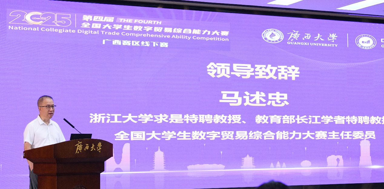 承办本次大赛表示感谢,他指出,全国大学生数字贸易综合能力大赛由浙江大学中国数字贸易研究院于2022年创办,现已成为颇具影响力的全国性品牌赛事。3月以来,本届大赛先后得到了广西、黑龙江、甘肃、河南等省份的教育厅或高等教育学会的正式认定;5月23日在长春举办的第63届高等教育博览会上,本赛事成功入选第2轮普通高校大学生商科类竞赛指数榜单,充分彰显了大赛的专业性和认可度。
