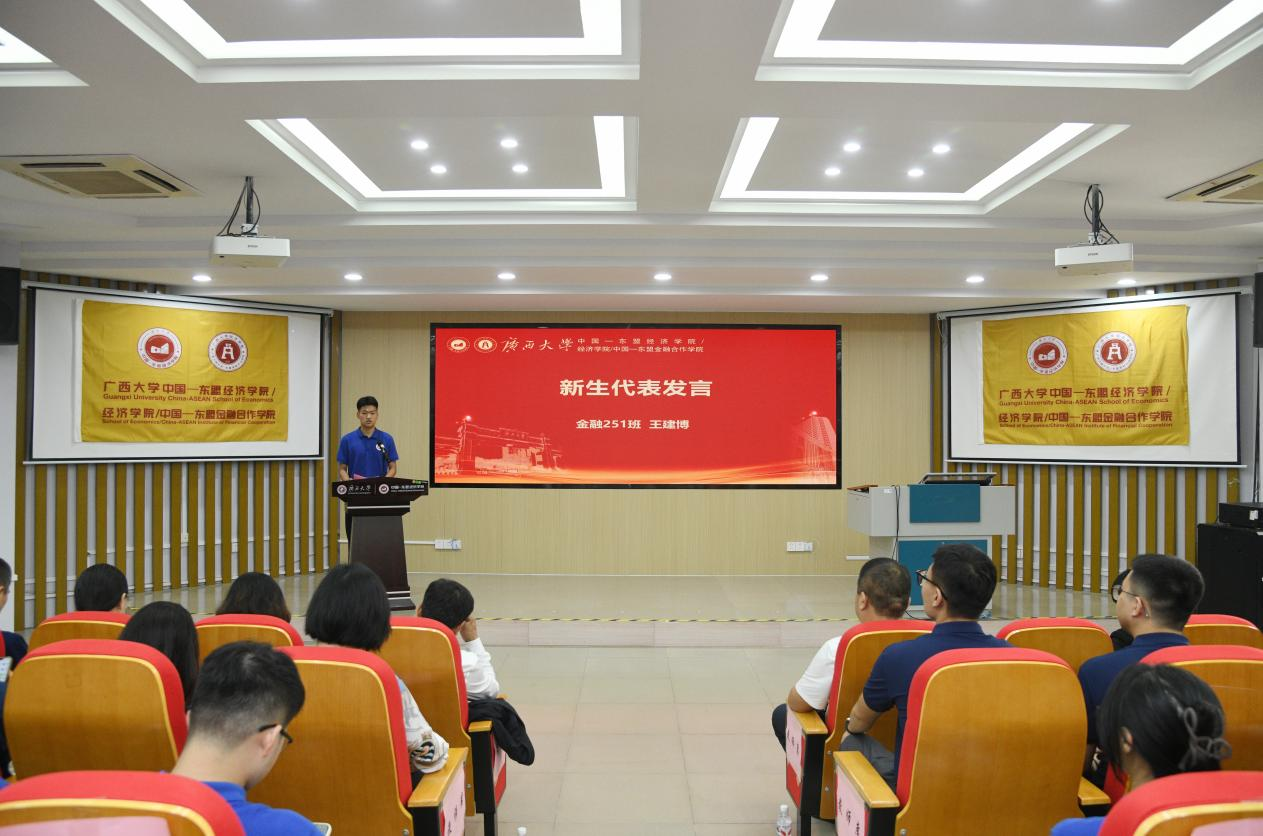 在新生发言环节,2025级本科生新生代表金融251班王建博首先表达了自己加入学院的荣幸与感激之情。他号召同学们牢记校训,认真打好专业基础,积极参与实践活动,在集体中共同成长,努力成为懂经济、能实干、全面发展的西大人,不负时代、不负韶华。