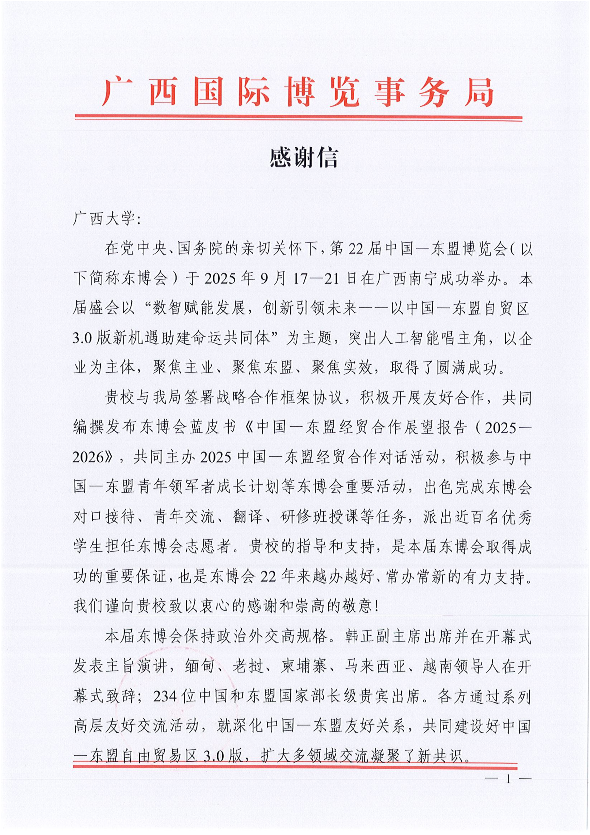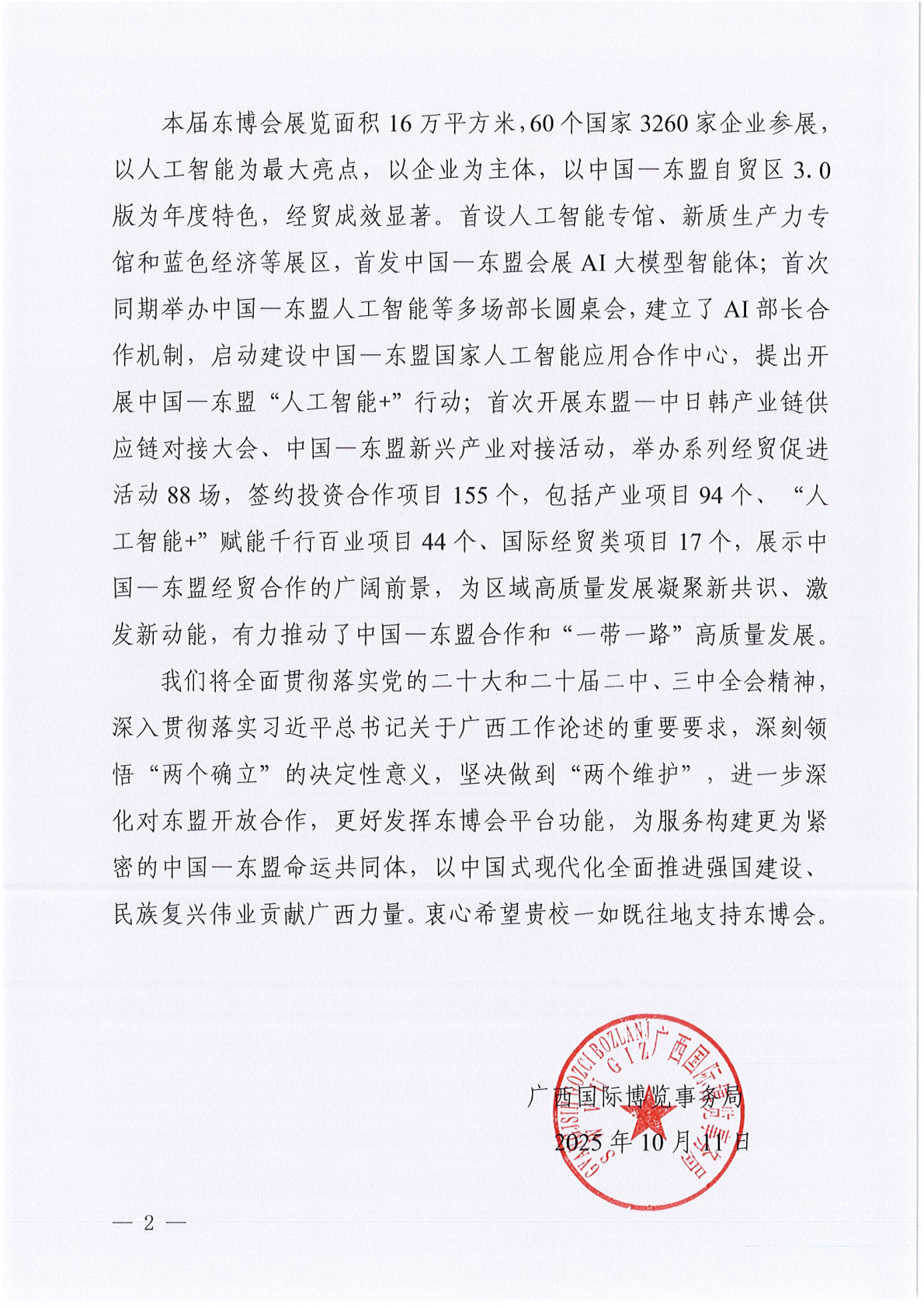 感谢信指出,我校与广西国际博览事务局共同主办2025中国—东盟经贸合作对话活动,积极参与中国—东盟青年领军者成长计划等东博会重要活动,出色完成东博会对口接待、青年交流、翻译、研修班授课等任务,派出近百名优秀学生担任东博会志愿者。