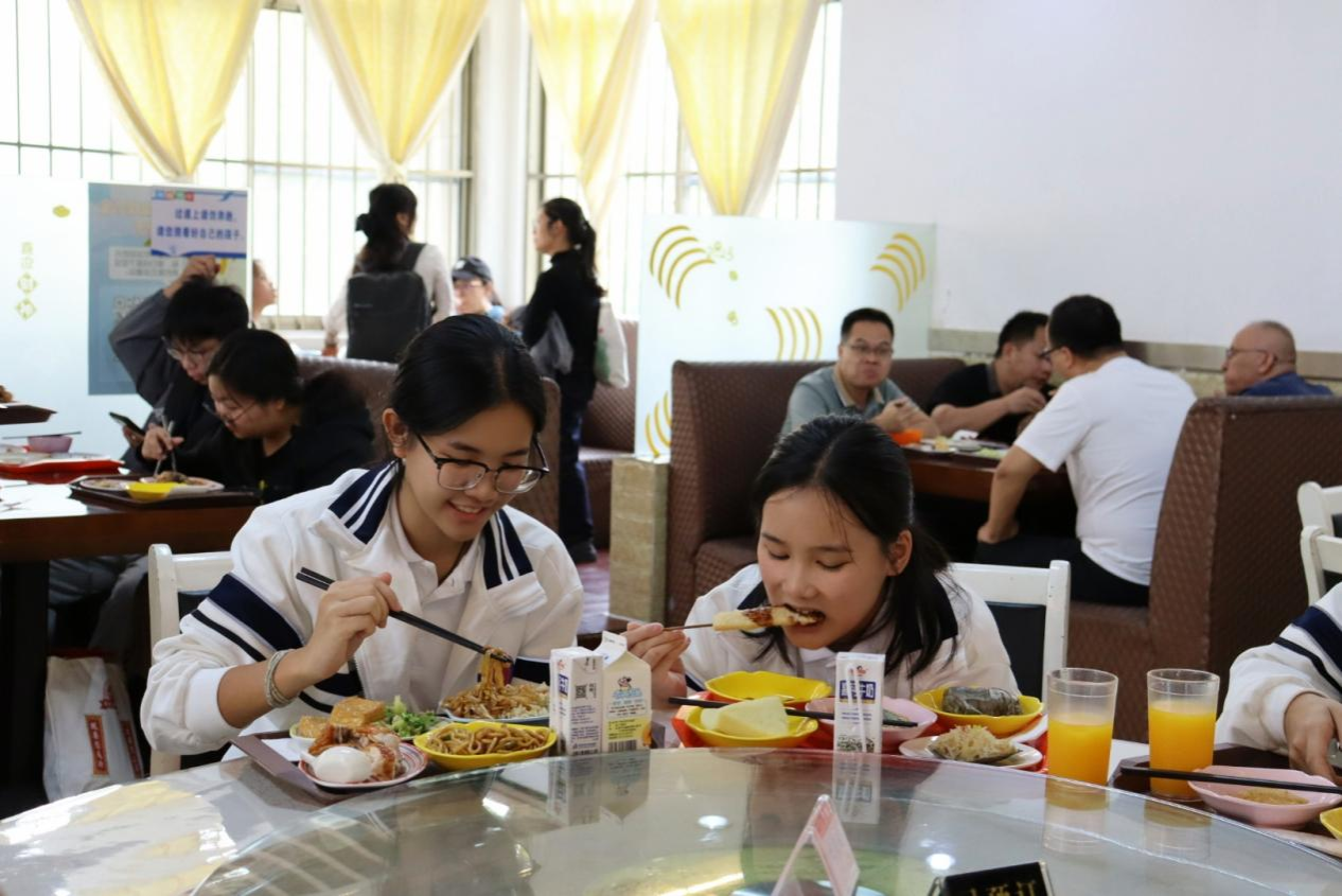 同学们品尝本校食堂的美食