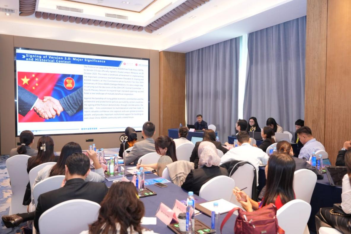 11月24日,由商务部主办、中国—东盟博览会秘书处承办的2025年中国—东盟自贸区3.0版创新实施研修班在广西南宁开班,东盟9国及东盟秘书处41名学员参加。为落实学校与中国—东盟博览会秘书处的战略合作内容,学院精心选派两位资深专家为学员进行专题授课。