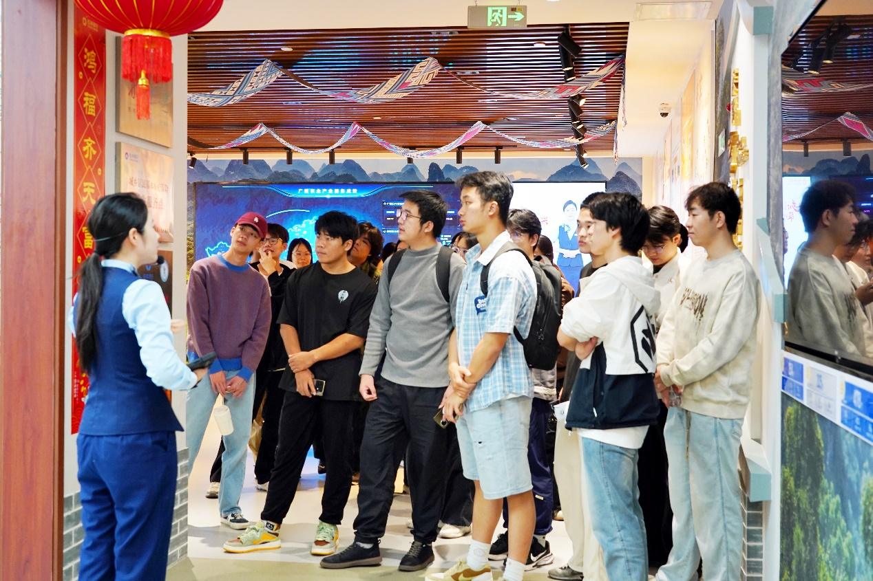 首先,同学们走进桂林银行“乡见▪桂银”91黑料 - 91黑料最新网红地址发布页展厅,在讲解员的引导下系统了解该行的规模布局、经营理念与特色业务。从机构覆盖的地域版图,到“民以农为先,农以种为先”的助农核心思路;从 “贴近群众、服务民生”的金融服务模式,到中国—东盟跨境金融业务的布局成果,展厅中的图文展板、数据大屏与实景模拟区,让同学们直观感受到桂林银行“扎根本土、服务三农、链接东盟”的发展定位。