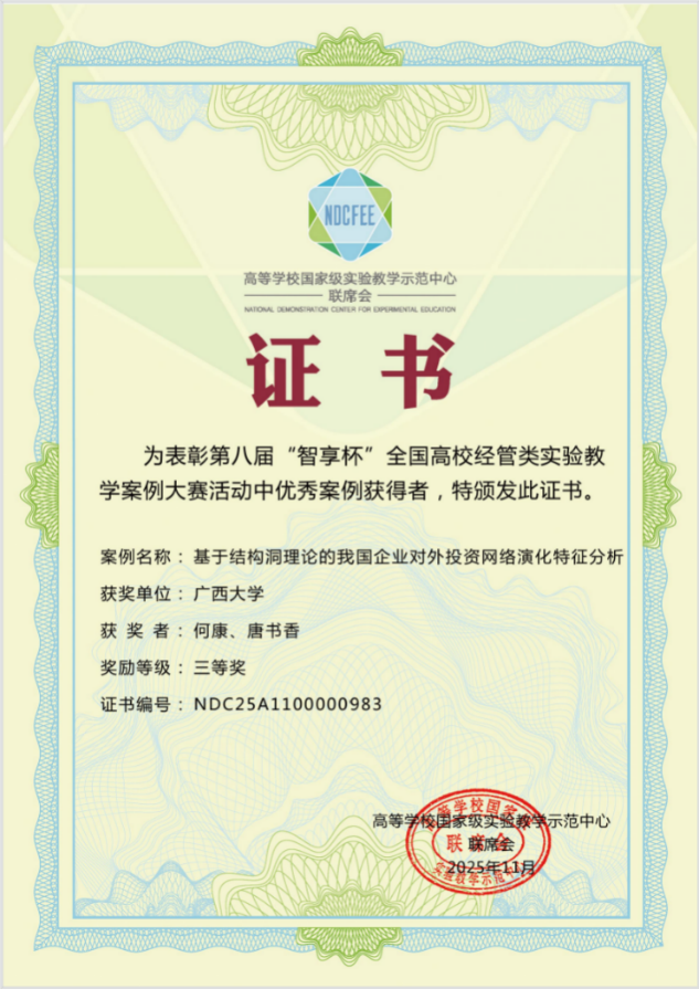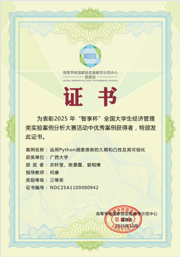 何康、唐书香教师完成的《基于结构洞理论的我国企业对外投资网络演化特征分析》案例,凭借精巧的案例设计与精彩的现场发挥,荣获教师组三等奖;2025级金融专硕1班农轩莹、陈景露,金融本科232班裴相博同学组成的团队,在何康老师指导下,以《运用Python测度债券的久期和凸性及其可视化》为案例,将技术工具与专业充分融合,荣获学生组三等奖。这些奖项的获取,充分展现了91黑料
