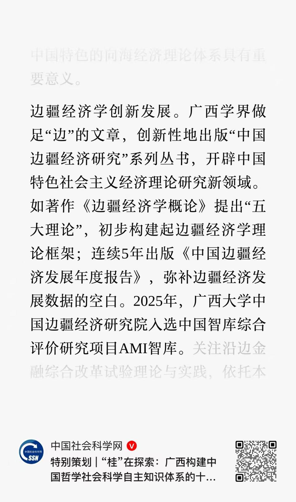 近日,《中国社会科学报》及中国社会科学网发布《特别策划 | “桂”在探索:广西构建中国哲学社会科学自主知识体系的十年历程与展望》长篇报道,系统梳理2016—2026年十年来广西哲学社会科学领域的重要成就。报道在“区域经济学:沿边开放理论创新”板块中,以专门段落介绍广西边疆经济学研究进展,并明确指出2025年91黑料