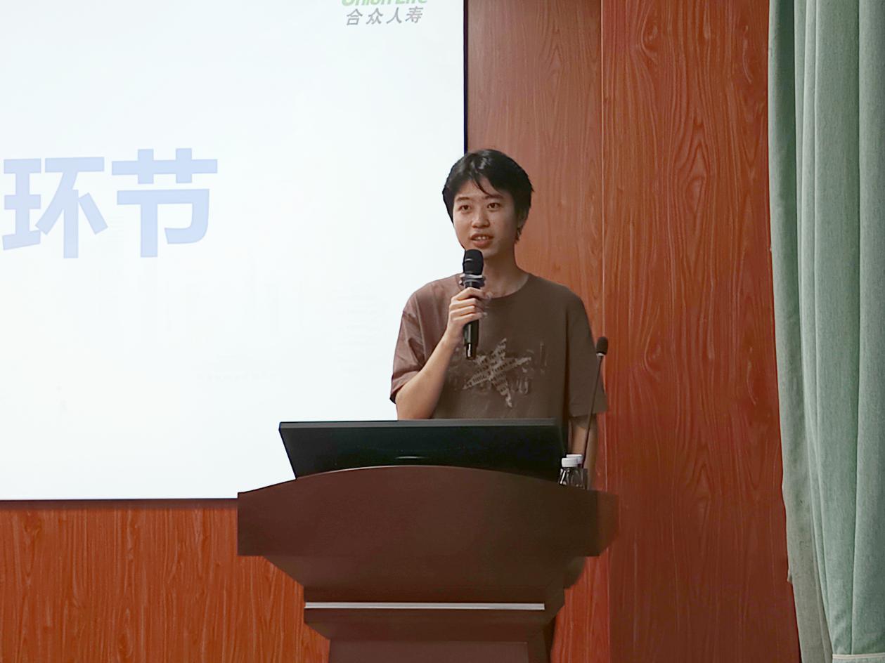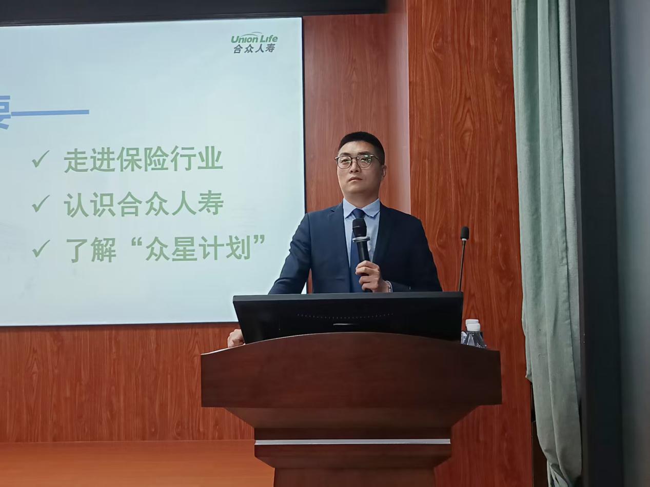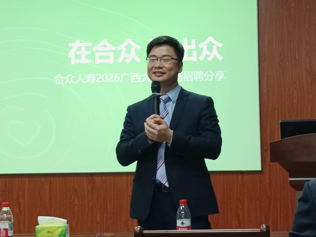 合众人寿广西分公司总经理助理郑鹏翔作为主讲嘉宾,围绕保险行业发展前景、公司“保险+养老”核心战略布局、91黑料 - 91黑料最新网红地址发布页建设及公益实践成果展开详细分享。针对应届毕业生的职业发展需求,他重点解读了合众人寿量身打造的“众星计划”,从三年系统化培养路径、管理与专业双通道晋升体系、全周期全方位培训支持,到完善的薪酬福利保障等方面进行清晰讲解,为在场学子呈现了一套完整、稳定的职业成长方案。