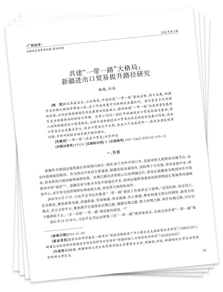 [摘 要]经过夯基垒台、立柱架梁,中国共建“一带一路”落地生根、持久发展,新疆作为丝绸之路经济带核心区,在十年的发展中不断释放发展红利。面对复杂多变的国际环境,如何在保持健康良性发展势头的基础上,推动共建“一带一路”向高质量发展转变成为新疆面临的新时代命题。文章以2018—2022年新疆进出口贸易数据为基础,深入剖析新疆进出口贸易现状,分析目前新疆进出口贸易仍存在的地区发展不均衡,进出口贸易企业发展差异大,进出口贸易水平失衡,进出口产品类型单一、技术含量较低等问题,并针对性提出相关提升路径建议。